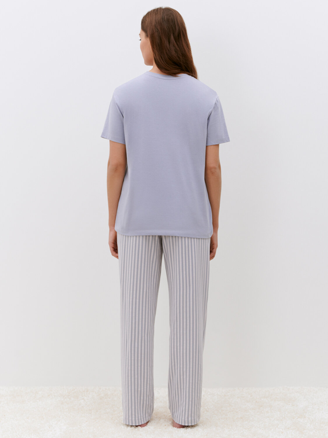 "Женский домашний комплект: свободная футболка с коротким рукавом и круглым вырезом, и прямые брюки с карманами и поясом на резинке.Изготовлен из высококачественного хлопка, который отлично пропускает воздух, приятно ощущается на теле и подходит для чувствительной кожи. Комфортный повседневный костюм для дома и сна, который идеально сочетает в себе лаконичный дизайн, удобный крой и качественное исполнение. Представлен в трендовых базовых цветах. "