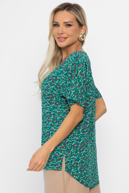 Блузка с коротким рукавом в изумрудном цвете, выполненная из плательного штапеля, — это отличный выбор для создания модного и изысканного образа! Спущенные рукава и разрезы по бокам придают этой блузке лёгкость и удобство, что делает её идеальным вариантом для жарких дней. Она прекрасно сочетается как с юбкой, так и с брюками, позволяя вам создавать разнообразные комплекты для любого случая. Добавьте эту универсальную блузку в свой гардероб и наслаждайтесь летними прогулками с уверенностью!