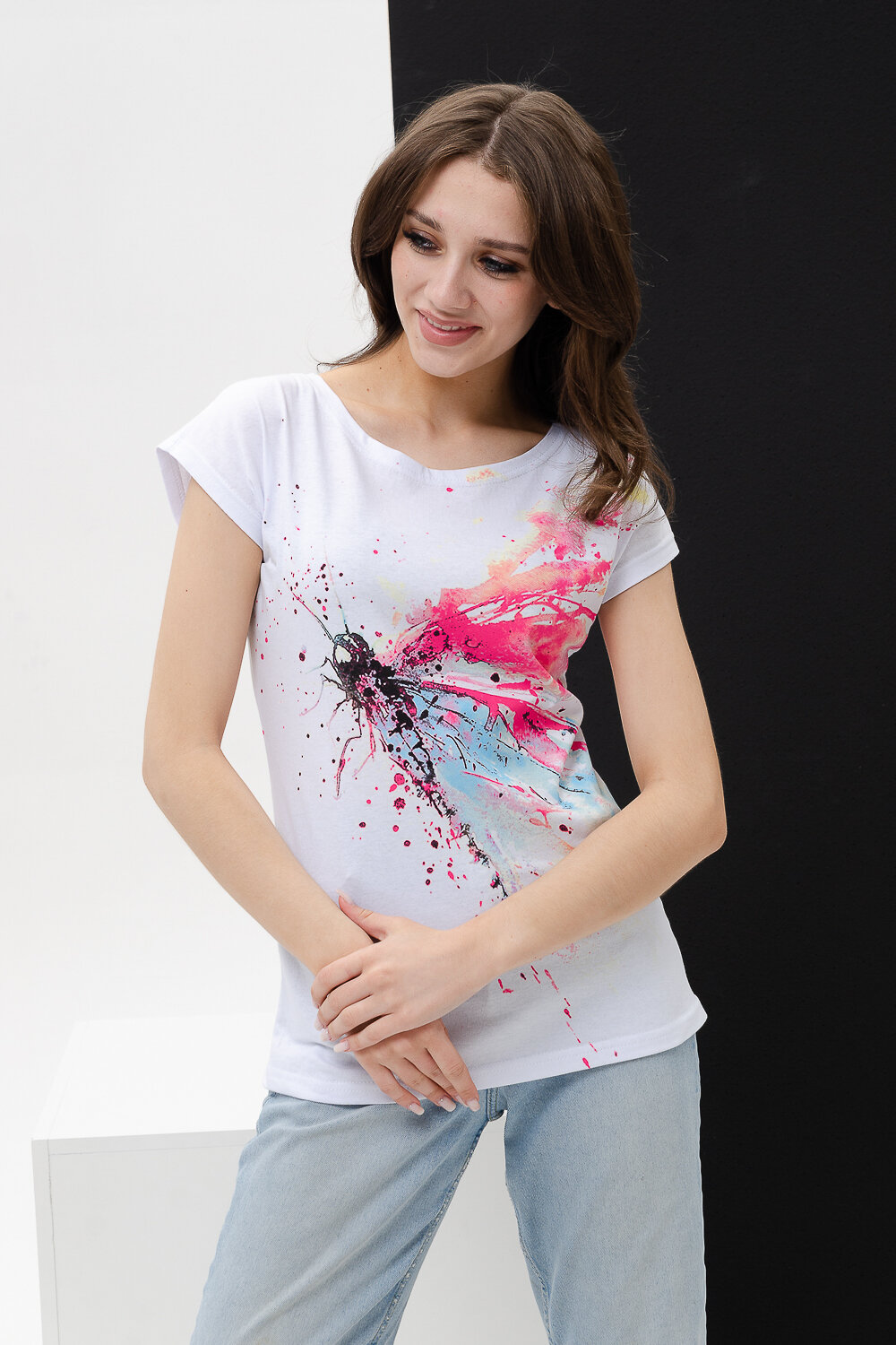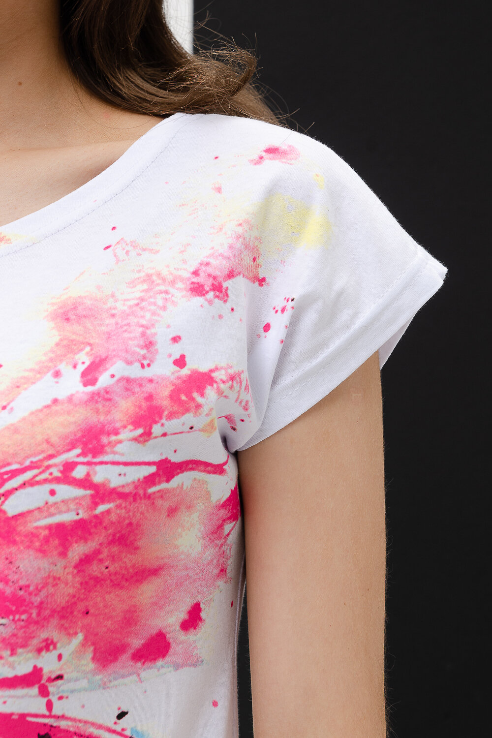 Футболка полуприлегающего силуэта, средней длины, с округлой горловиной. Рукав цельнокроеный, короткий.