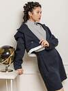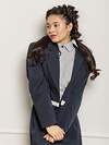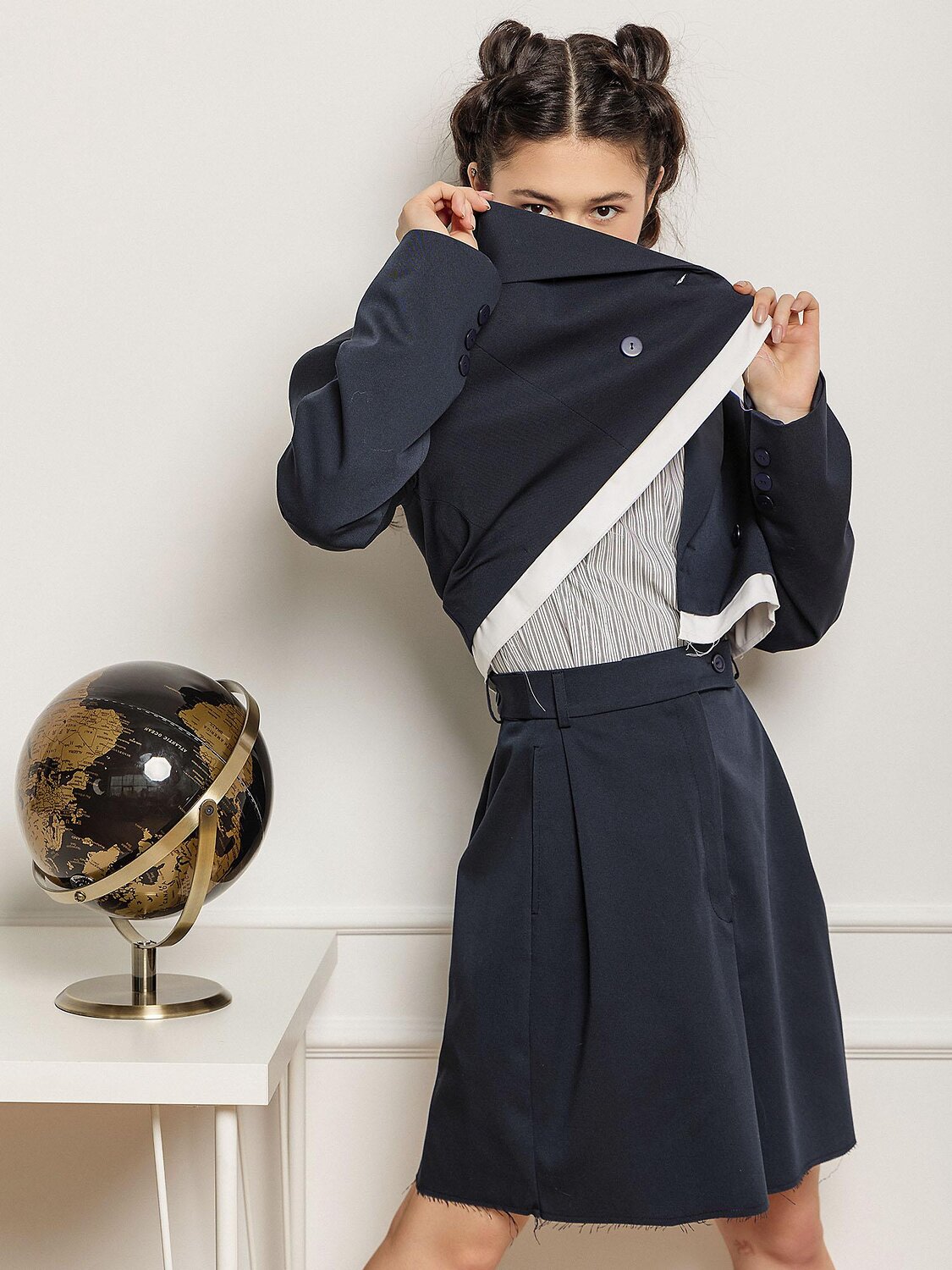 Жакет укороченный темно-синий на подкладке для девочки. Застежка двубортная, рукав двушовный эргономичный. Костюмный воротник, по низу декоративный элемент из сорочечной ткани с необработанным краем.