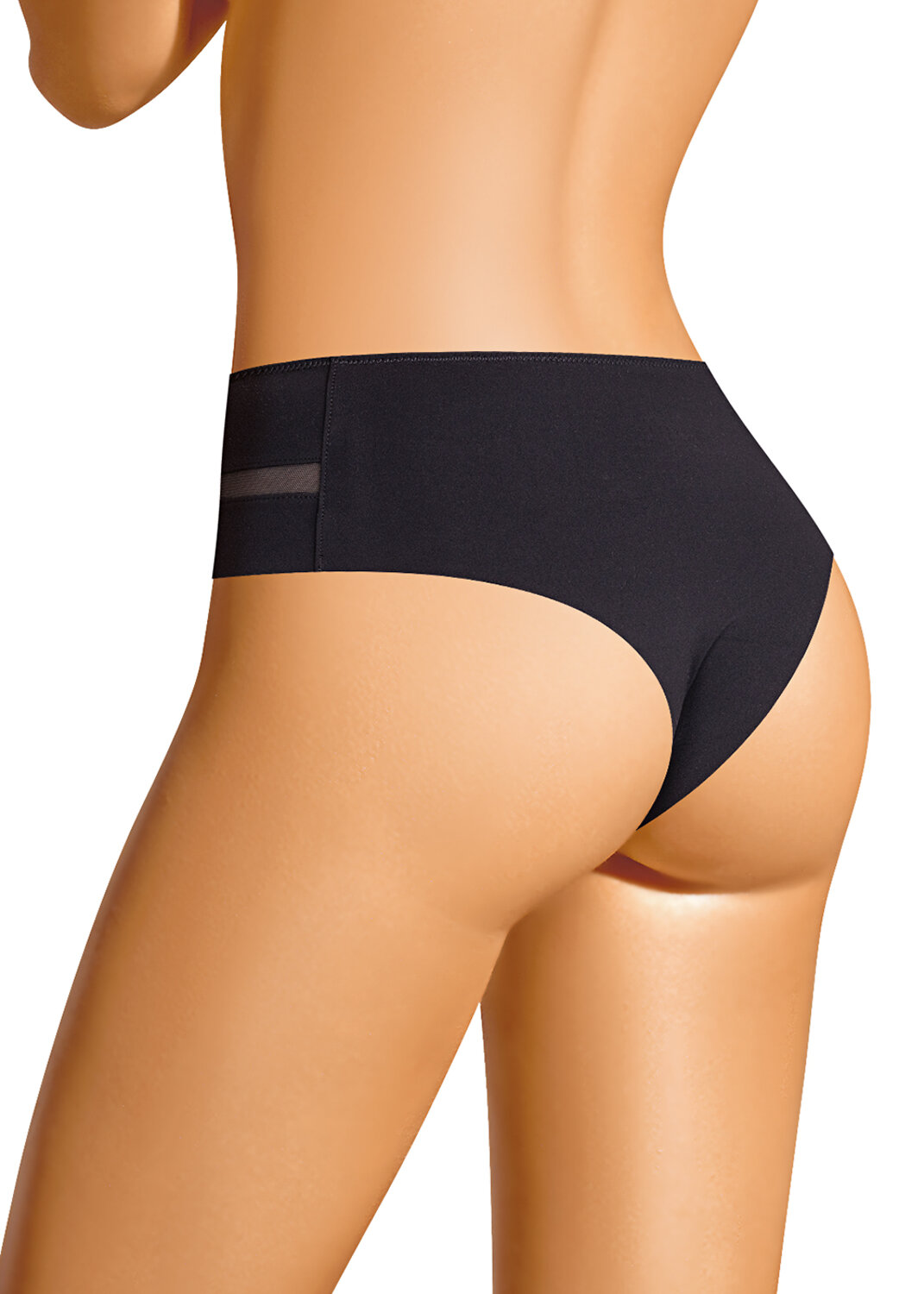 Трусы бразилиана с завышенной посадкой, сзади и сбоку бесшовная гладкая обработка, спереди декоративные горизонтальные вставки из плотной сетки, перед дублирован сеткой, по талии обработка с зигзагом и узкой резинкой
