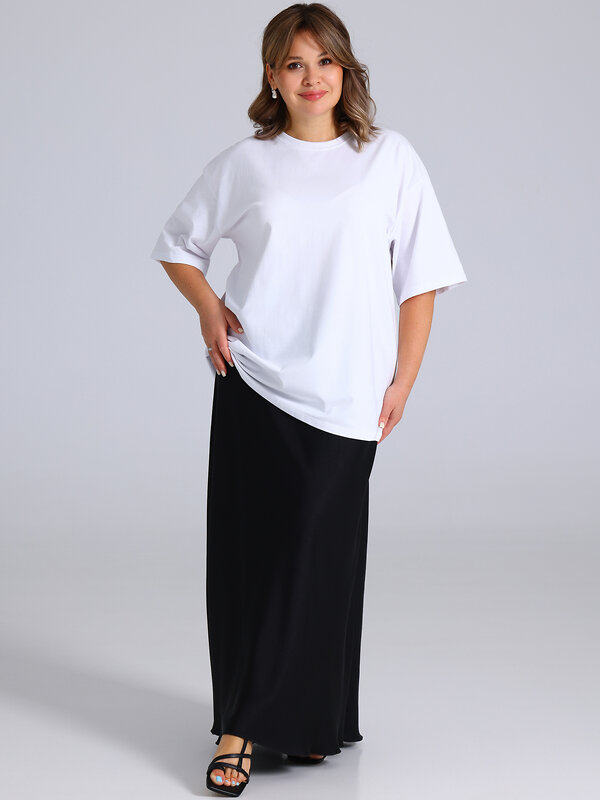 Футболка выполнена из кулира - легкого хлопкового полотна с лайкрой. Изделие свободного покроя со спущенным плечом, рукавами длиной 1/2 и круглым вырезом горловины. Уход: только машинная стирка (руками не стирать!) при температуре 40 градусов, без предварительного замачивания.