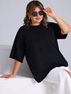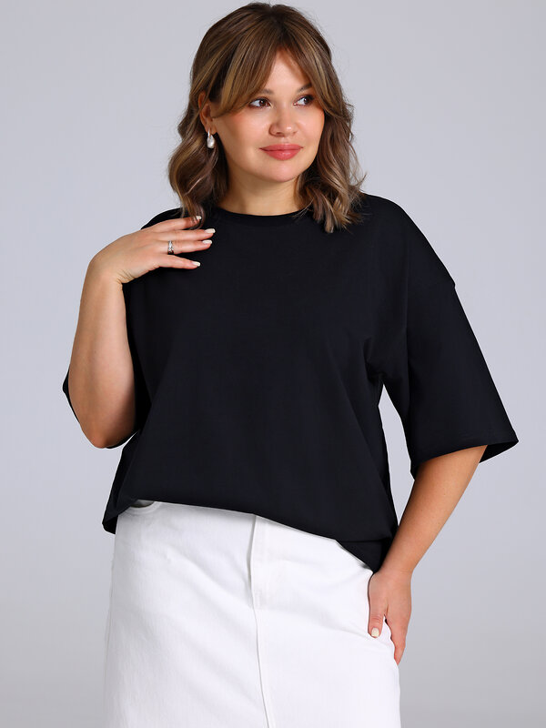 Футболка выполнена из кулира - легкого хлопкового полотна с лайкрой. Изделие свободного покроя со спущенным плечом, рукавами длиной 1/2 и круглым вырезом горловины. Уход: только машинная стирка (руками не стирать!) при температуре 40 градусов, без предварительного замачивания.