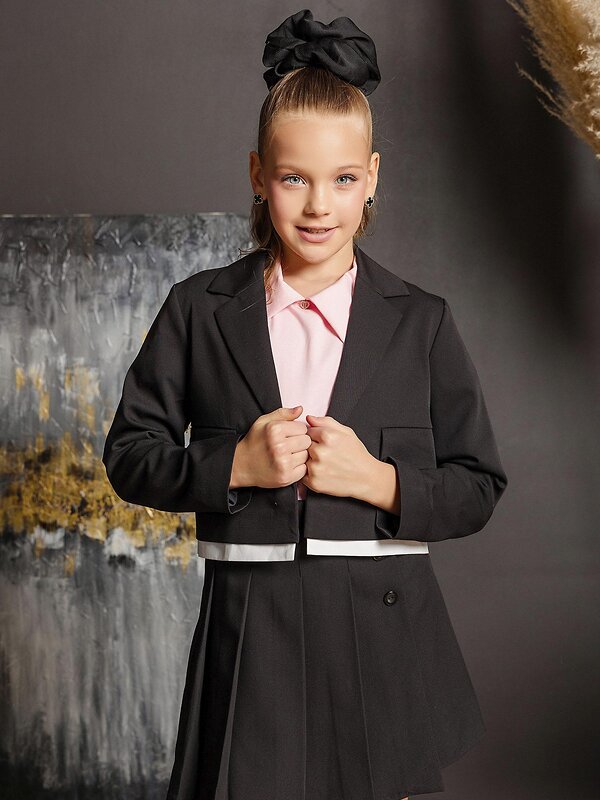 Жакет укороченный на подкладке для девочки. Застежка на одну пуговицу, рукав двушовный эргономичный. Два кармана с клапаном, костюмный воротник. По низу декоративный элемент из сорочечной ткани.